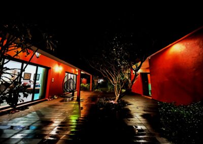 屋外には鯉が泳ぐ池や植栽豊かな庭園が配置され、視覚的にも安らぎを提供します。